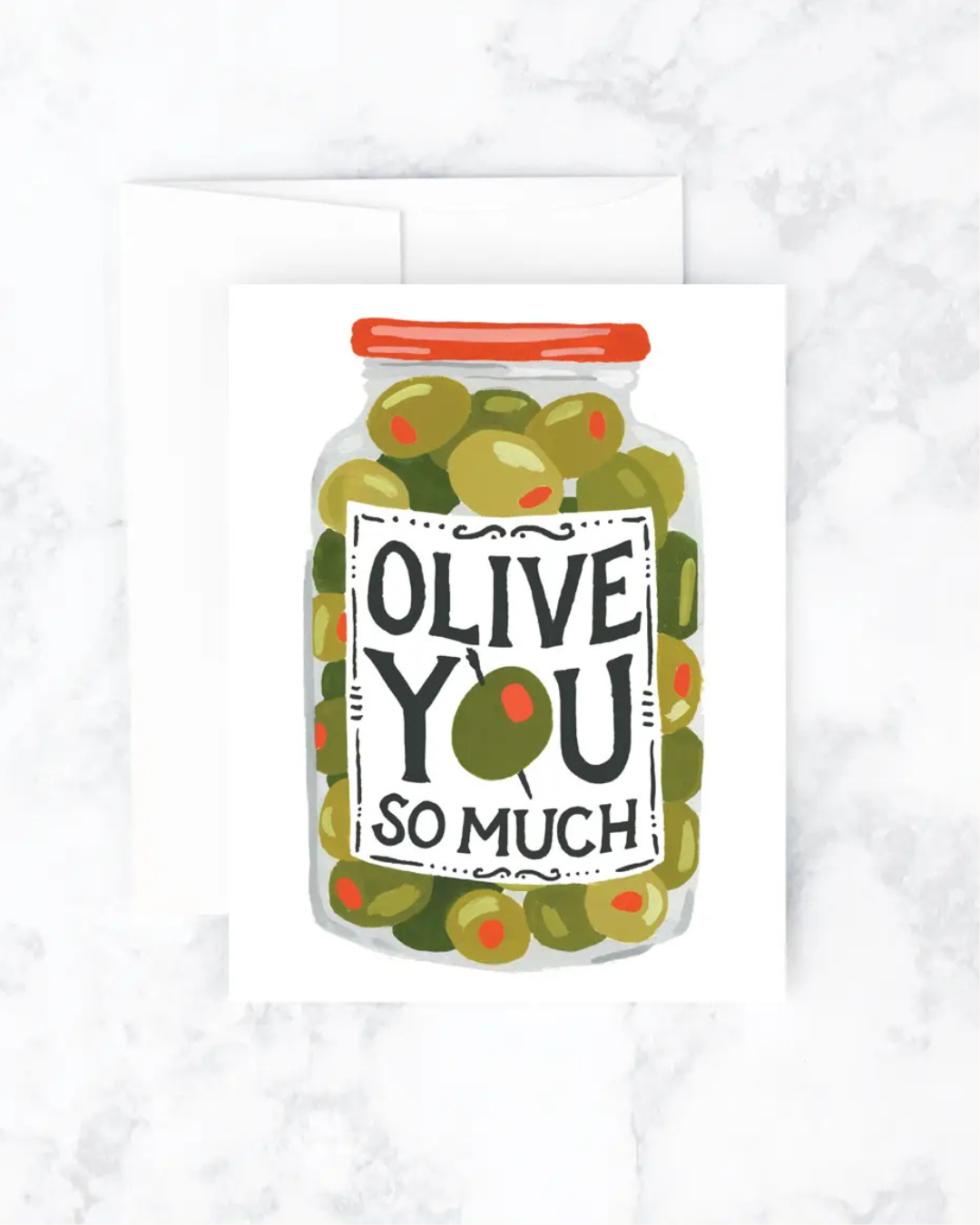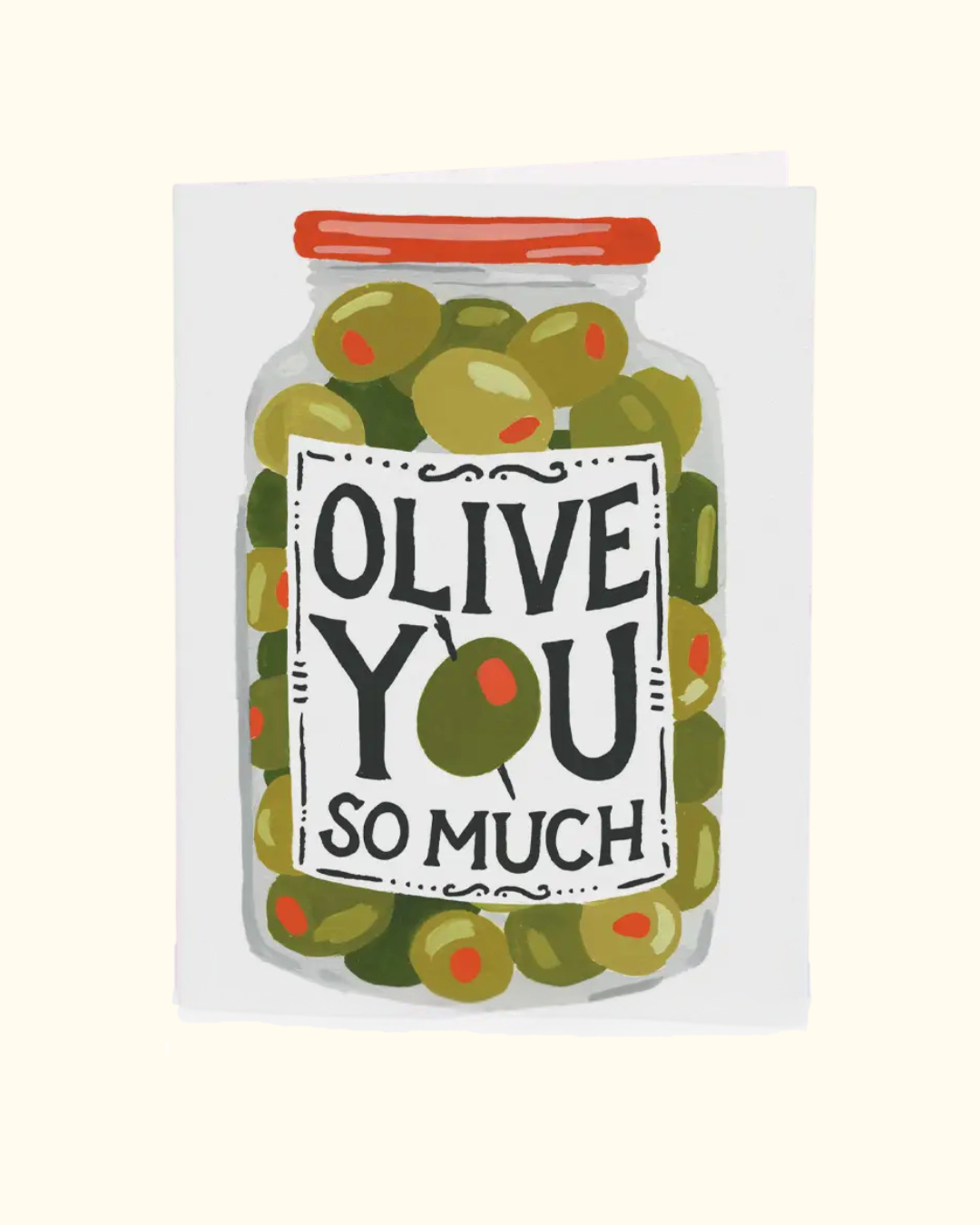 We love a punny Valentine, and this one is extra cute. The Olive You Card features a charming illustrated jar of olives with the message "Olive You So Much!" Perfect for your favorite person on Valentine's Day, anniversaries, or just because.